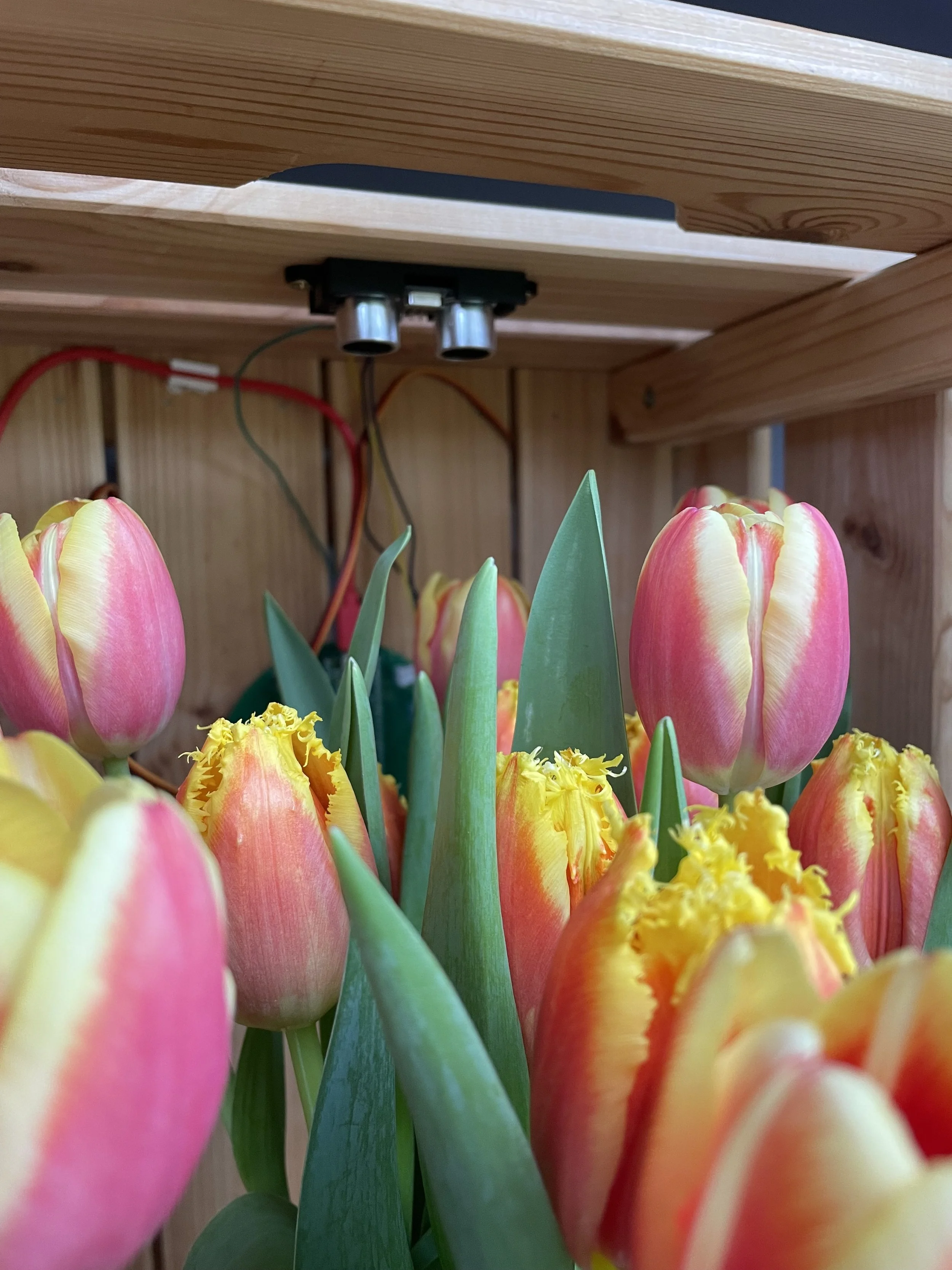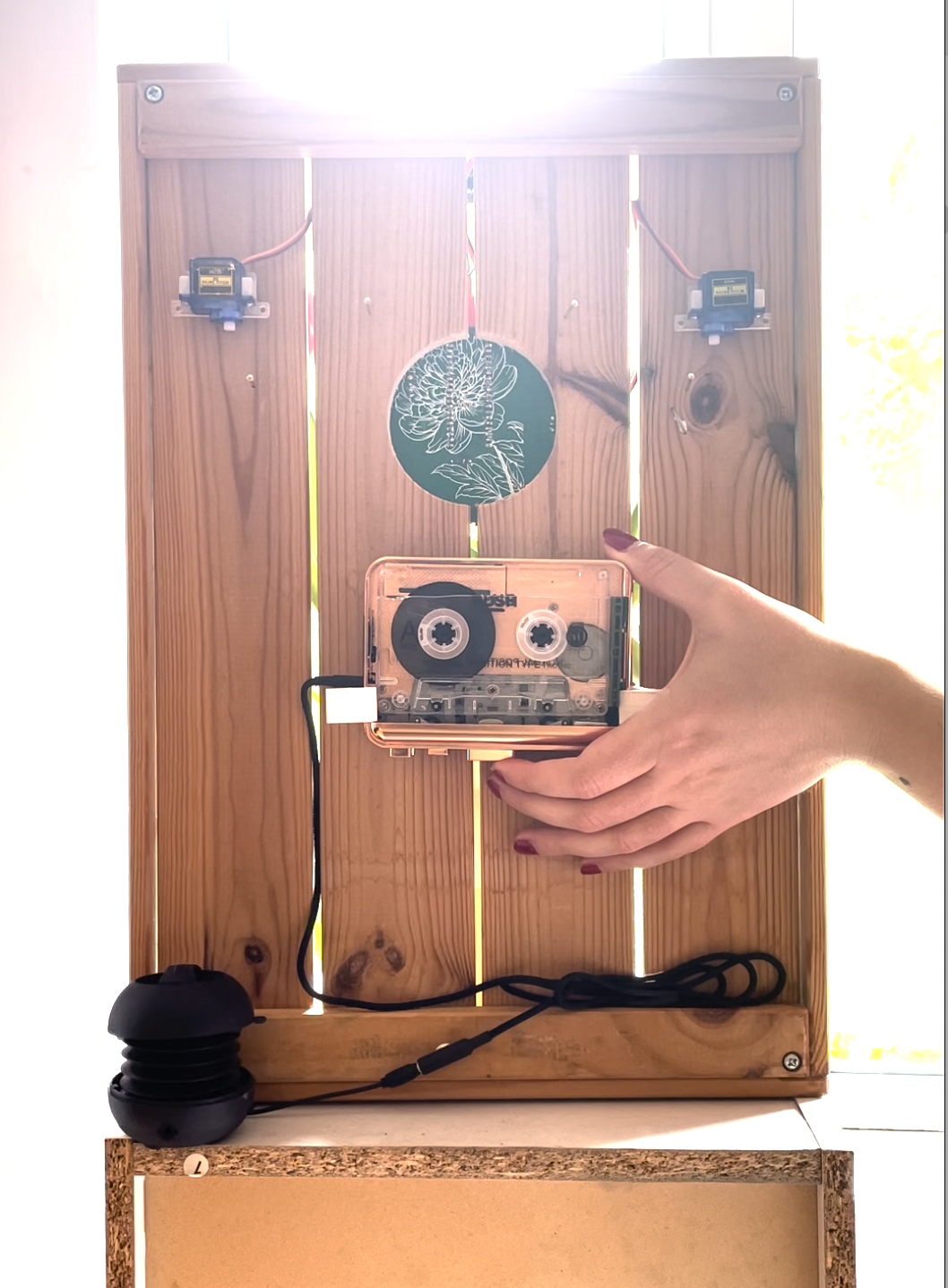 The flowers are positioned inside a wooden box, with an ultrasonic sensor right above them. At the back of the box there are motors with magnets and a cassette player with a speaker, playing a recording of lists of obsolete media formats and software. The ultrasonic sensor and the servo motors are connected to a PCB especially designed for this project, which uses a Raspberry Pi Pico W. The ultrasonic sensor measures the distance between itself and the flowers, and as these start to decay and wilt (and the distance increases) it triggers the servo motors to change their position with increasing frequency.As the motors move over the tape, the magnets erase the content on the cassette, giving the recording a similar lifespan to that of the flowers.